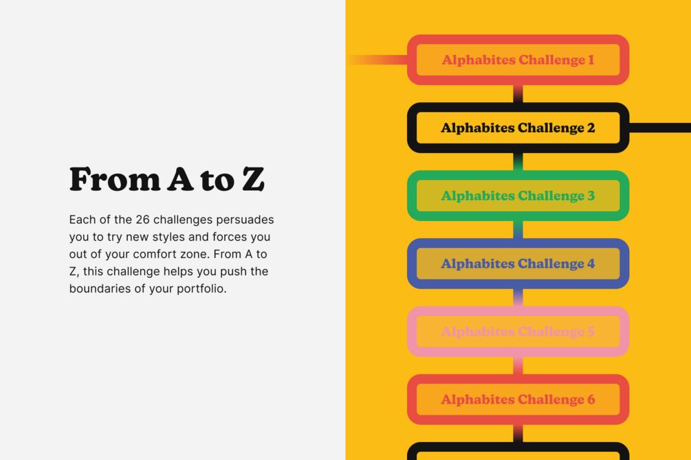 The Alphabites Design Challenge is a set of alphabetical design tasks for creatives to improve their logo design and typography knowledge. Each of the 26 challenges persuades you to try new styles and forces you out of your comfort zone. From A to Z, this challenge helps you push the boundaries of your portfolio.